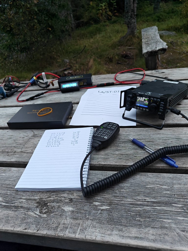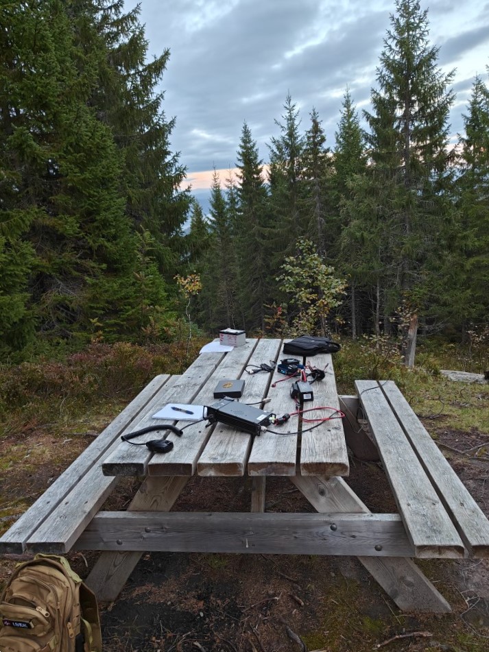 For my second SOTA activation I decided to try something new. Liaåsen, LA/ST-011 is a small hill just outside Trondheim, Norway with a transmitter mast on top. It's a popular location for hiking and quite popular with SOTA hams. I have been there before, but for other reasons than SOTA. My previous activation I used a PAC-12 7MHz-50MHz antenna from Aliexpress and it worked okay, but it was quite narrow banded and I wanted to remedy that. In my box of radio stuff I had a 5.6m whip antenna that would be the perfect length for 20m. Since its segmented it would also allow me to easily do 17m and 10m. Very fortunately there was a bench we could install ourselves and the equipment on.